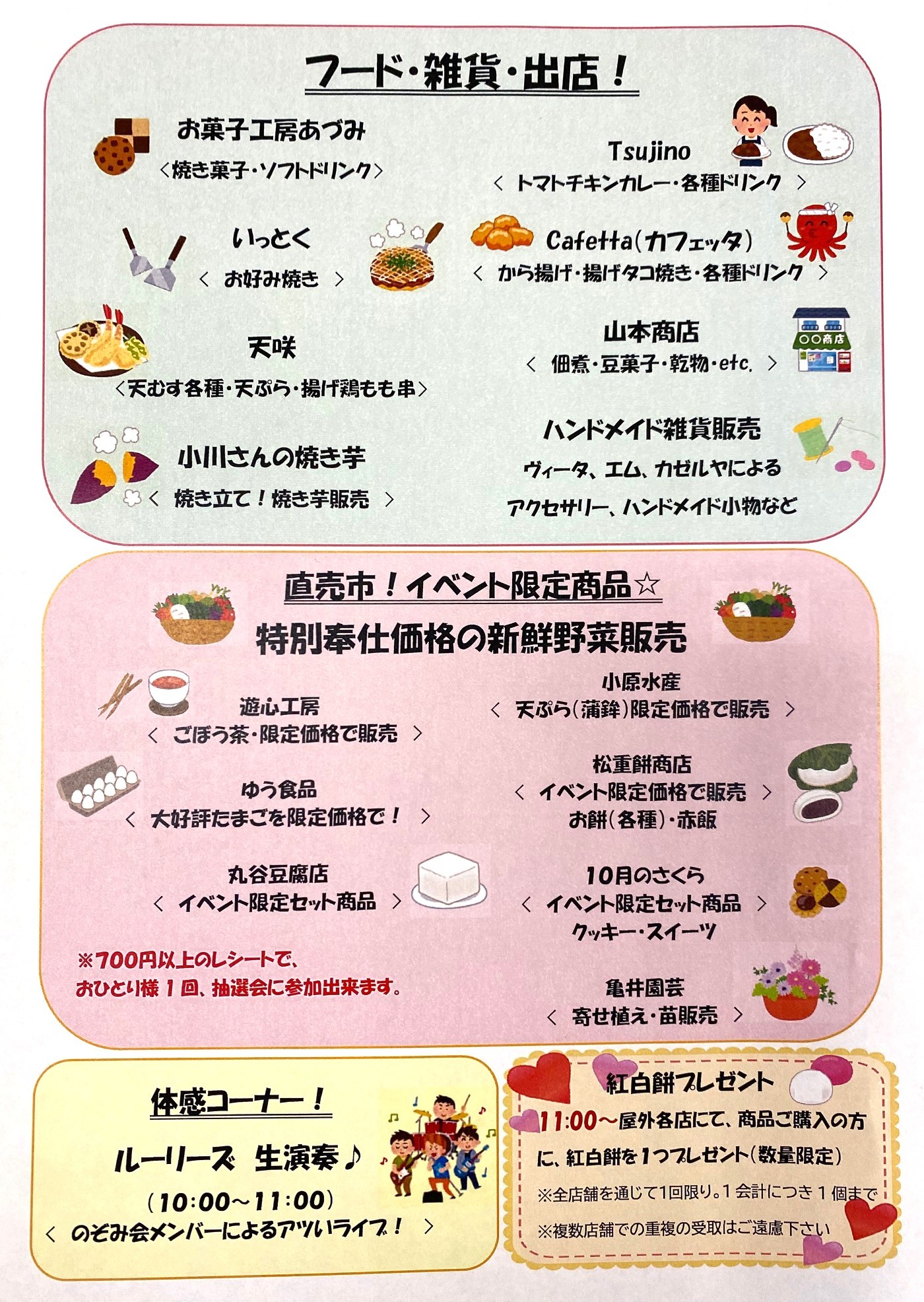 お買い得な商品をたくさん用意しております。また、大抽選会、バンド演奏、キッチンカーや地域のクリエイターの方の雑貨など内容も盛りだくさんです。